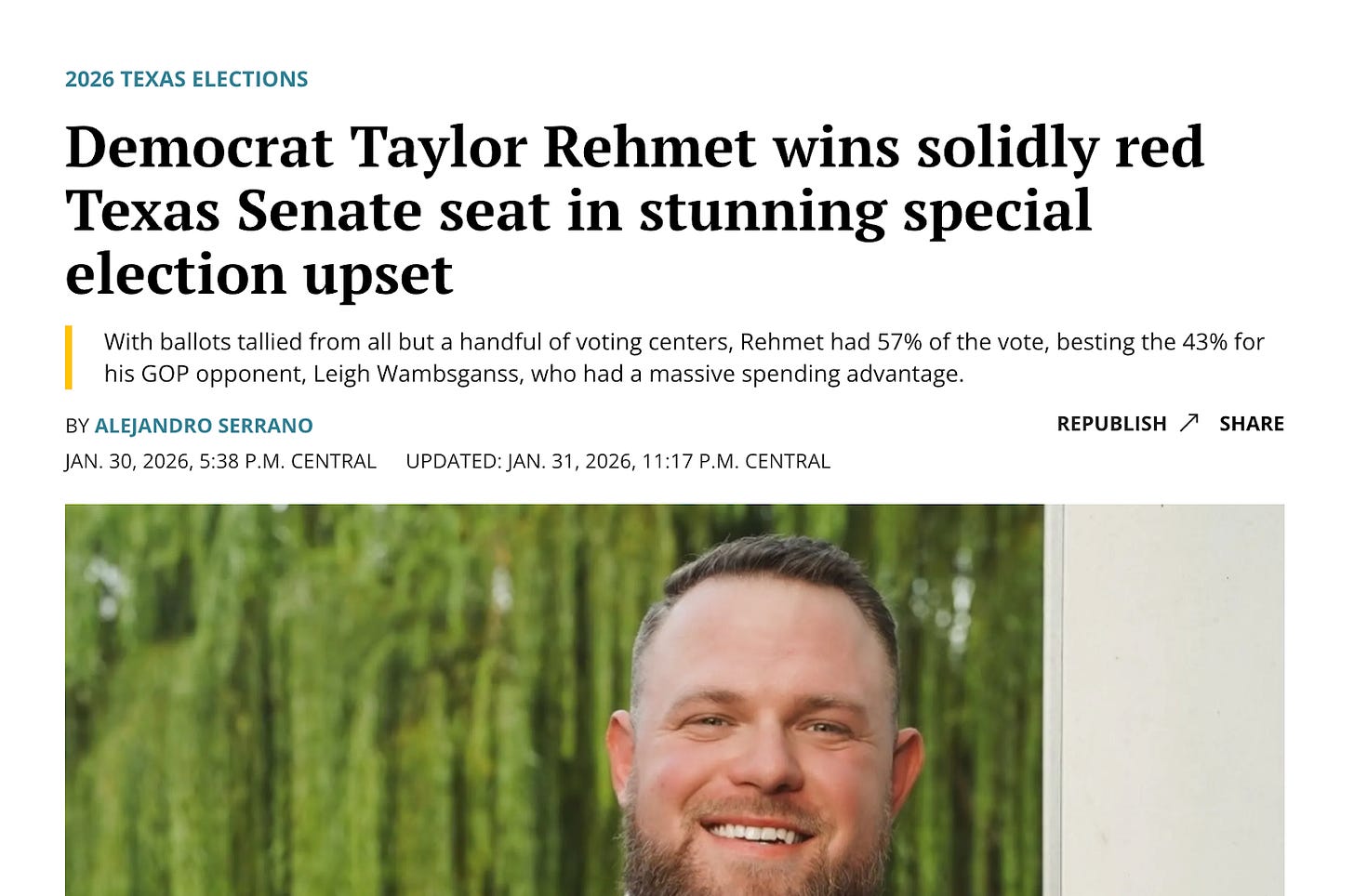 Last week, a Democratic veteran won a stunning special election in a Texas Senate district that Donald Trump carried by 17 points. Democrat Taylor Rehmet was outspent 10-to-1 and still managed to upset the Trump-endorsed candidate in a ruby red district.