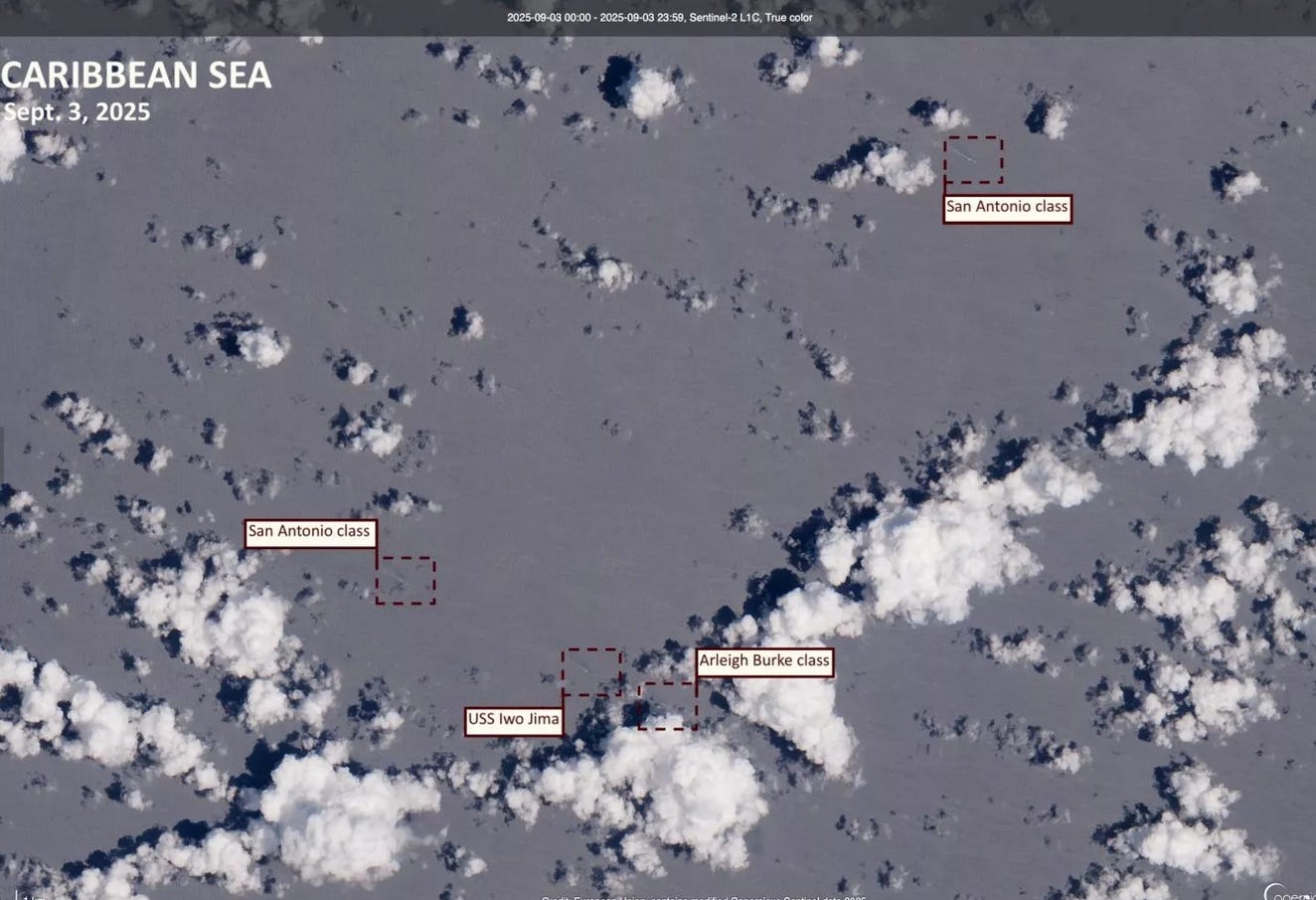 Satellite imagery from the European Space Agency Satelite-2 showing American vessels off the coast of Venezuela. Retrieved from here