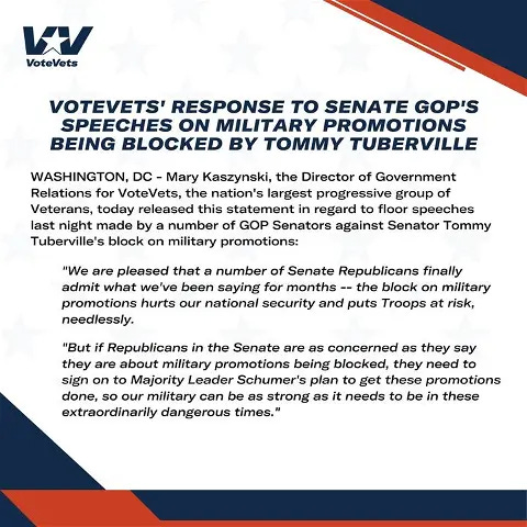 Finally, this week we’ve seen multiple Senators loudly denounce Tuberville over his hold following months of silence. Lindsey Graham spoke fervently on the Senate floor, “No matter whether you believe it or not, Senator Tuberville, this is doing great damage to our military. I don’t say that lightly.” So far Tuberville has stubbornly resisted lifting his hold. It will take additional public criticism of Tuberville by his fellow Senators, as well as by you the public connecting with your Senators, telling them that you want to end the politicization of military promotions, and by extension this crisis. At VoteVets, we have been orchestrating a publicity campaign to ensure the public understands the damage caused by this radical hold, including planting signs on Capitol Hill with the faces of each officer being denied promotion and producing advertisements such as this one