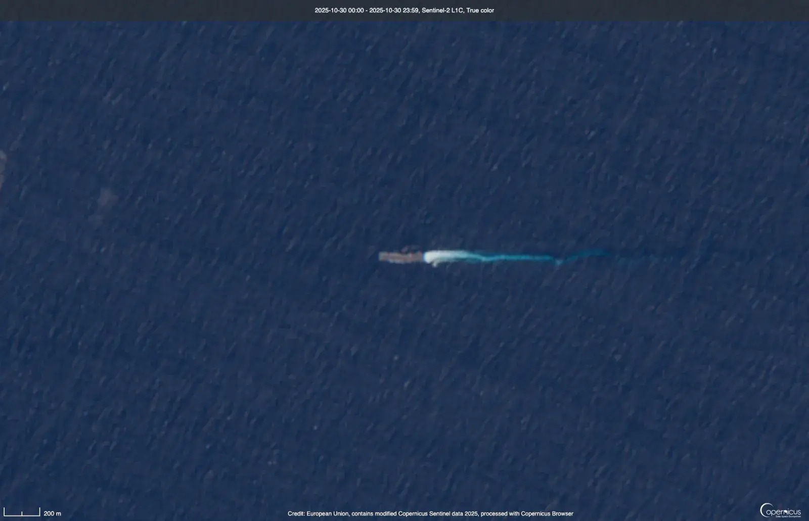 Satellite imagery captured by the European Space Agency of the USS Iwo Jima maneuvering in the eastern Caribbean Sea. Source article linked here.